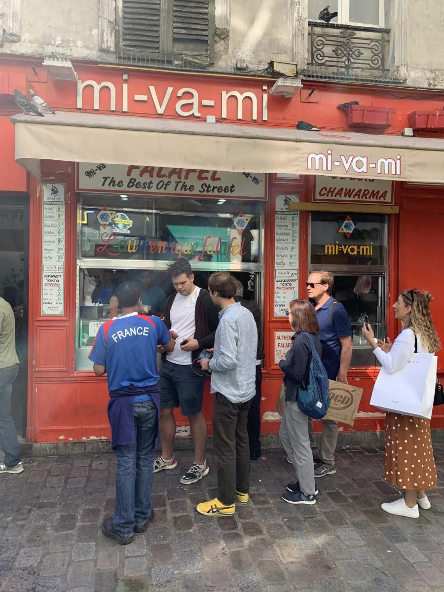 Området Marais är värt ett besök av många olika anledningar. Nyetablerade modemärken, second hand-butiker, kaféer, bagerier, barer och restauranger trängs längs gatorna. Folkmyllret är i sig spännande att beskåda, men kan försvåra en bordsplacering kring lunchtid. Bäst avnjuts därför Mi-va-mis utomordentliga falafel utomhus, på stående fot, mitt bland all rörelse och kommers.