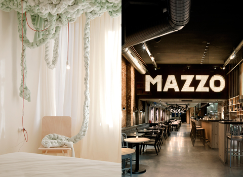 Ett jättelikt vardagsrum för alla som vill umgås, äta, hänga eller även arbeta har skapats av inredarna på Concrete, som i princip ligger bakom många av stadens lite mer väldesignade restauranger. Plywoodhyllorna, de exponerade tegelväggarna, de spindellika lamporna Dear Ingo från Moooi och den upplysta Mazzo-skylten ger en precis lagom hemtrevlig stämning – och har givit stället pris för bäst designade restaurang i Nederländerna. Men för oss hungriga är nog de goda pizzorna ändå av störst intresse.