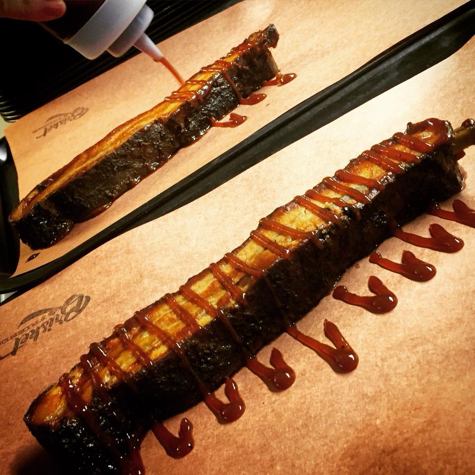 På brickor serveras det lång rökt oxbringa och burnt ends, med coleslaw och syrad rödlök vid sidan om, tillsammans med en kall öl från deras nya ölmärke Big Bones Brews. Det finns även vegetariska alternativ i kvällsrestaurangen, något man ser om man tar en titt ner längs det långa ekbordet.