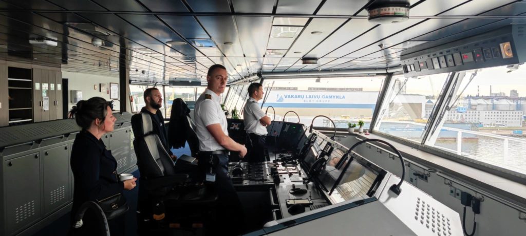 Nästa morgon får vi komma upp på bryggan och vara med när kapten Mindaugas Nosavičius vänder skeppet i hamn och backar in till kajen. Han har gjort denna manöver många gånger under sina fyra-fem år på bolaget DFDS. Det var också han som körde hem båten från Kina. Han verkar gilla sitt skepp.