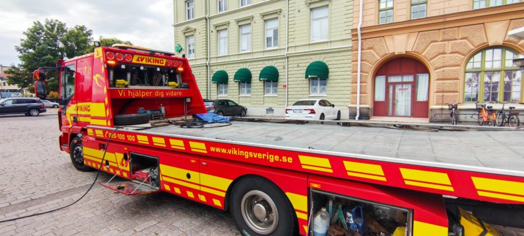 Jo, man letar i appen och efter lite ångest får vi kontakt med Viking vägassistans som lovar att skicka en gubbe. Efter en dryg timme dyker Kristian upp med en jättestor bil. Han verkar van vid män på gränsen till sammanbrott. Han parkerar lugnt sitt fordon och tar fram grejer som man använder för att byta däck. Efter en del pill med muttrar som behöver en speciell nyckel är det blankslitna däcket borta och ersatt med ett vinterdäck vi hittar i bagageluckan.