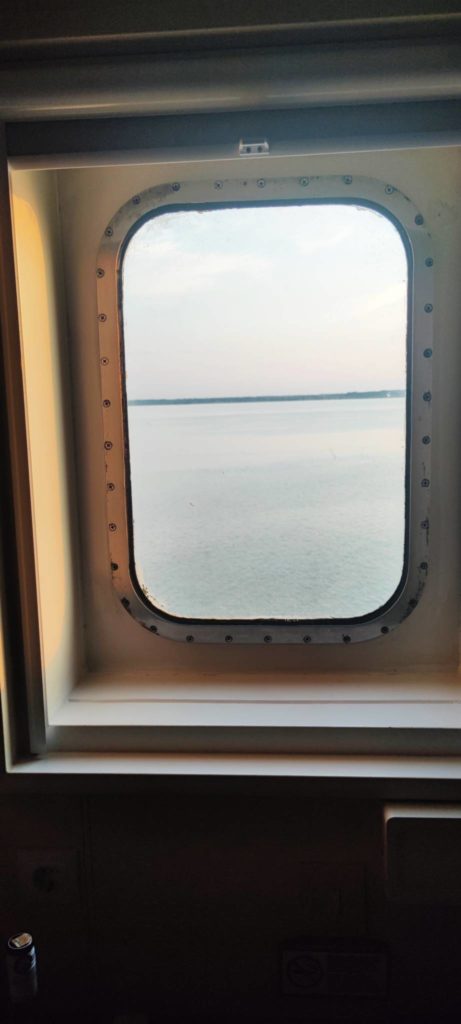 Färjan är en hög sak från Kina. Vår bil får bo på våning 7 och vår hytt är på våning 10. Utsikten från vårt lilla fönstret över Blekinge och Skånes kust är magiskt vacker. Havet är stilla, vindarna lugna och solen som sakta sänker sig i väster magnifik. Båten som lämnade sitt varv i Kina i februari och passerade Suezkanalen i april kan bäst beskrivas som fräsch. Och praktisk. Det finns plats för 4500 meter bilar och lastbilar. 53 personer i personalen kan serva upp till 600 passagerare. Pavel Alioškin som är servicemanager visar oss runt och vi får se på både de tre restaurangerna och de tre cellerna i vilka fyllbultar låses in i. De senare ockuperas ungefär en gång i månaden. Det är kapten som bestämmer vem som ska hamna där.