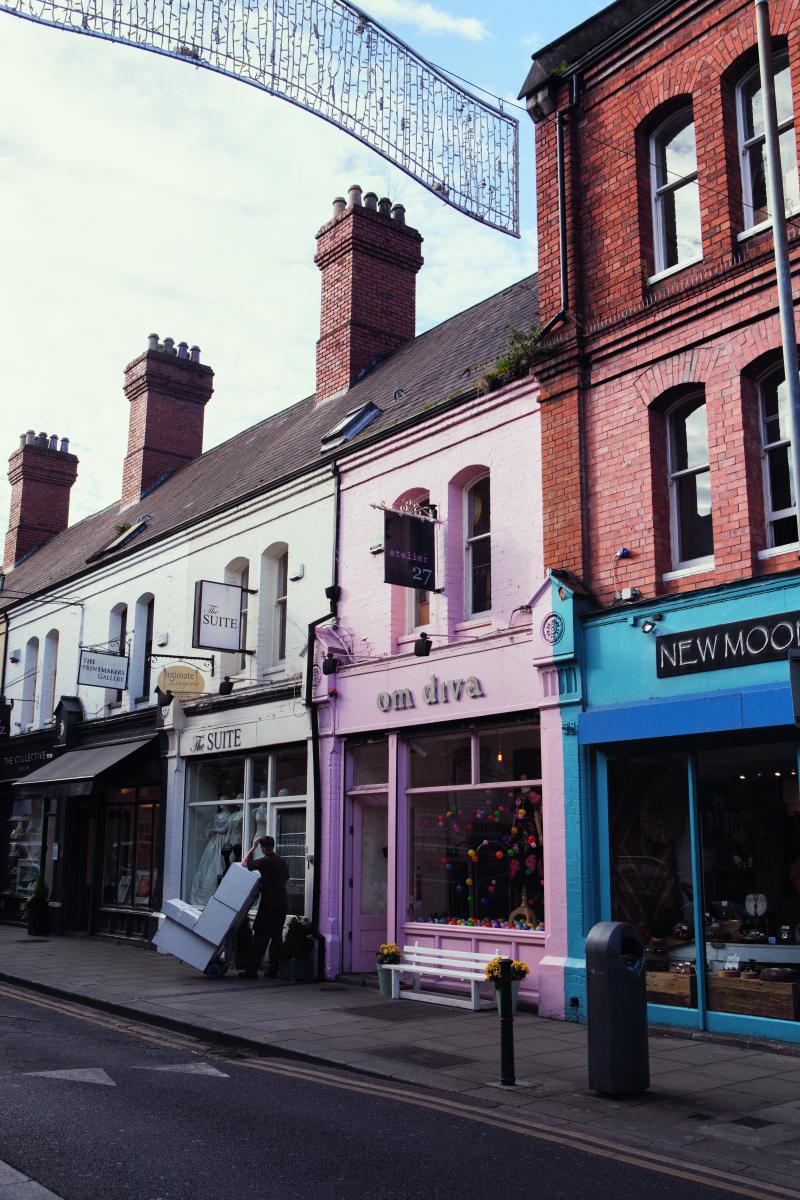 Vi tar heller inte nästnästa vänster in på Suffolk Street där jag annars har som vana att slå mig ned på O’Neills med ett exemplar av The Irish Times. Paltkoman som den spatiösa pubens kalkonstek framkallar lockar ofattbart nog inte sällskapet. I stället går vi Chatham Street fram, rundar The Hairy Lemons gullackerade fasad och tar sikte på den charmiga gallerian Powerscourt Centre. Efter det, via slaskbasaren George’s Street Arcade, möter vi sedan Emily O’Callaghan som driver en designbutik på South Great George’s Street.