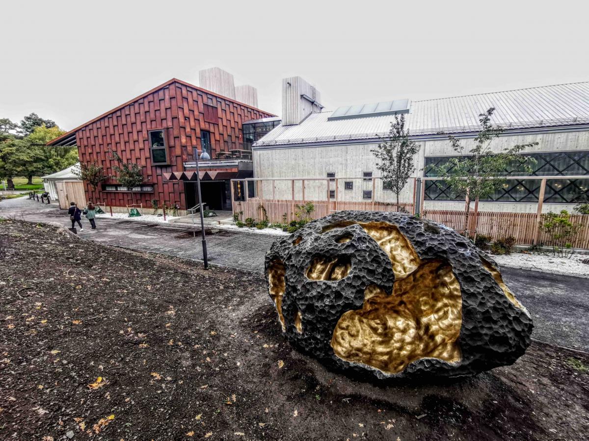 Men nu finns det ytterligare en anledning att gå hit förutom ett av Stockholms vackraste krogrum och stjärnkocken Tommy Myllymäkis mat. Utanför den nybyggda krogen har konstnärerna Bigert och Bergström placerat ett Rymdfrö. Det är en liten meteorit. Det sägs att det var en meteorit som dödade alla dinosaurier på jorden. Men det finns också teorier om att det var en meteorit som gav liv till jorden. Man kan alltså se Rymdfröt i koppar som det som förde liv till tråkiga Biskopsudden. Man kan också se skulpturen som en gyllene tryffel, men vi ser den främst som en rolig leksak och värmestuga före eller efter en fantastisk måltid. Om du upplever att det är stelt i matsalen kan du alltid klättra runt i denna.