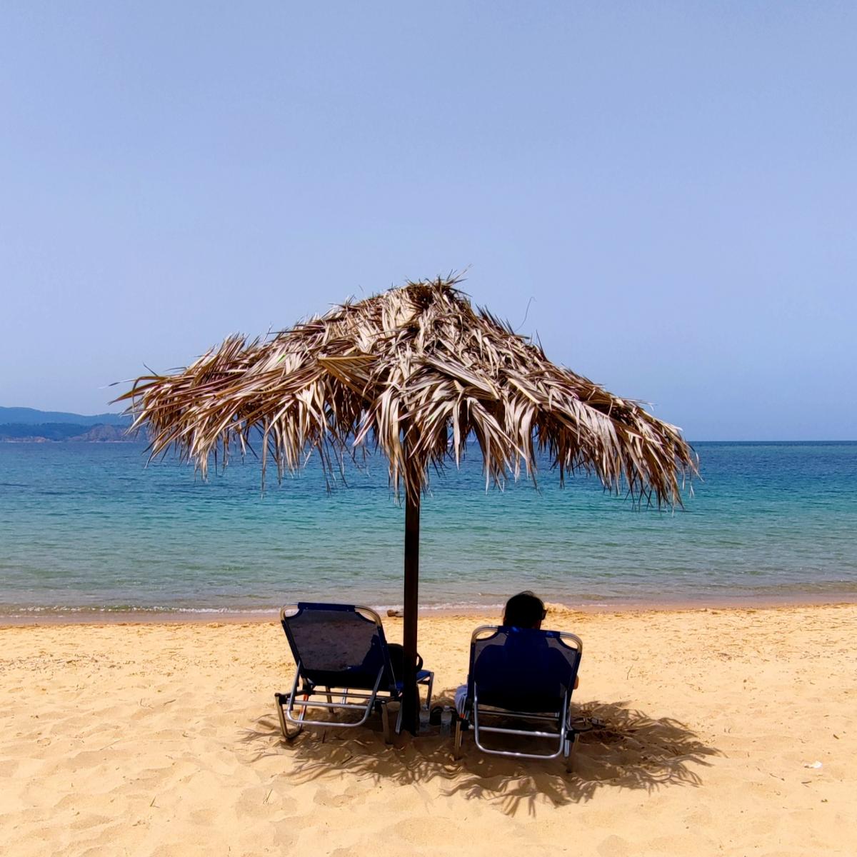 Vi bodde strax söder om huvudorten Skiathos och höll mest till på “vår” strand: Megali Ammos. Det är den första stranden söder om huvudstaden och här badar även många i lokalbefolkningen. Sanden är ganska grov, men längst in i bukten blir den finare. Här hittar vi även ett gäng små restauranger som alla serverar traditionell grekisk mat. Den smakar exakt som man förväntar sig och kostar inte mer. Servicen är vänlig och efter tre besök på samma taverna är du stamgäst. Förutom mat hittar vi också drinkarna Abba och Mamma Mia på menyn.
