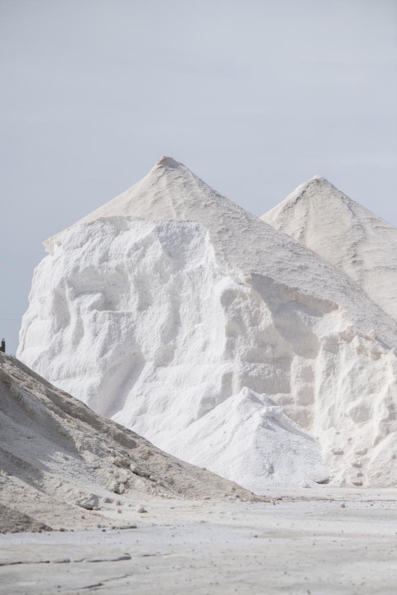 Bredvid finns ett antal fotbollsstora bassänger från vilka havssaltet hämtas. Det är det som ligger i 10 000 ton stora berg bredvid, och det vita saltet mot den blåa himlen ger en förståelse för inspirationen till varumärkets färger. Vattnet kommer hit via en kanal från havet 900 meter längre bort. Dessa saltvägar drar till sig olika fåglar, som till exempel den rosa flamingon. Det sägs att flamingon får sin färg av de rosa miniräkorna som lever i vattnet och som också ger bassängerna dess färg.