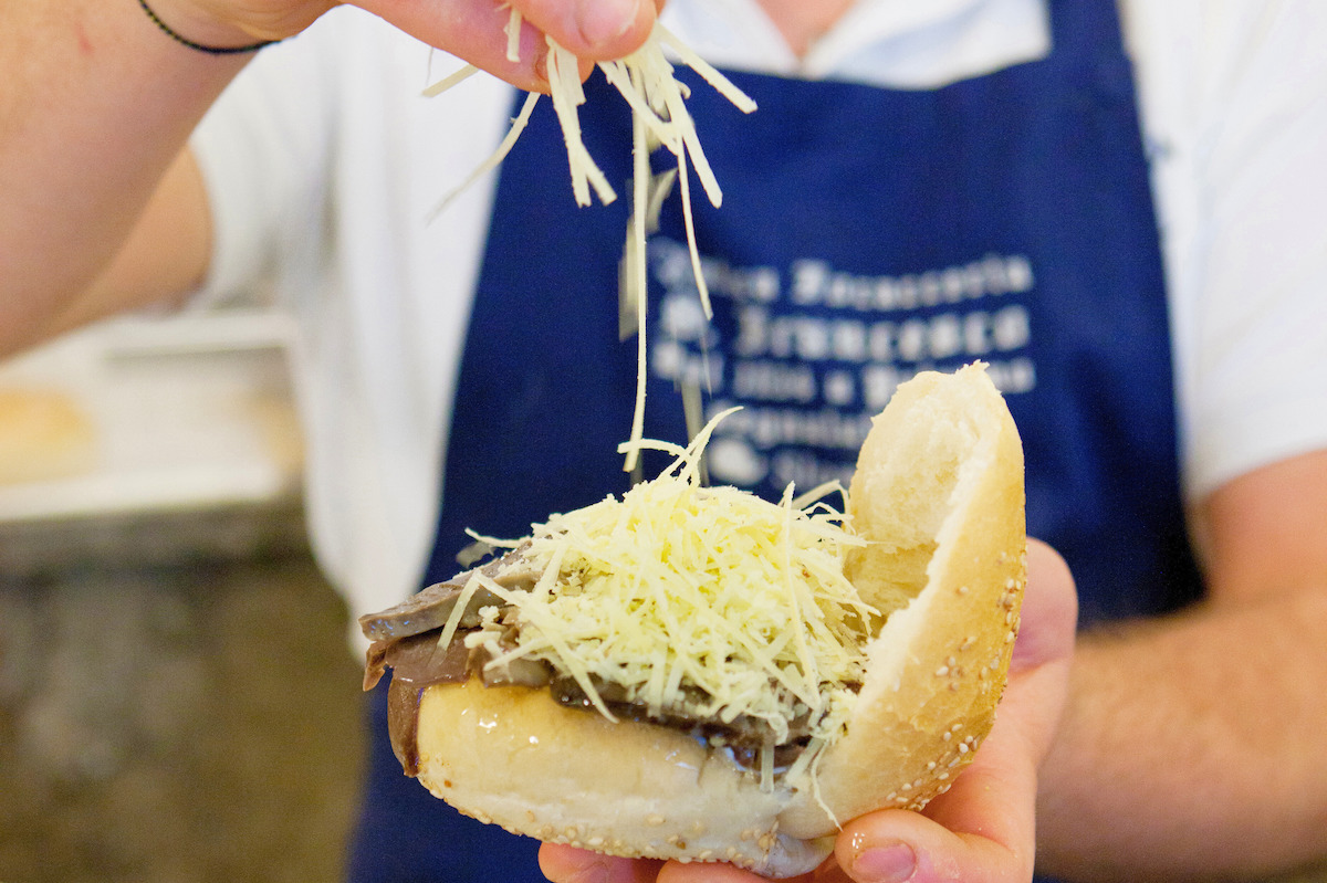 Missa inte att köpa en pani câ mèusa, en siciliansk specialitet som bokstavligen betyder ”bröd med mjälte” vilken säljs av i stort sett varje handlare.