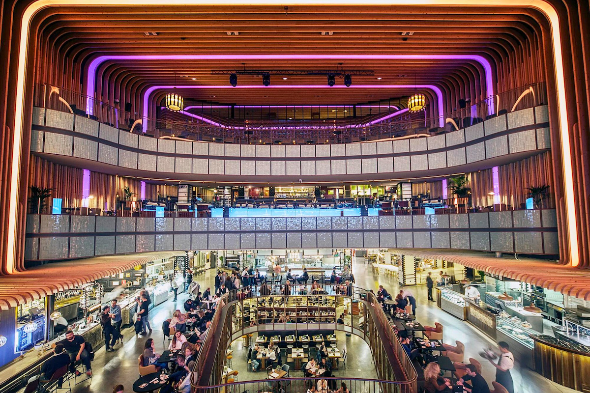 På markplan huserar ett femtiotal råvaruproducenter medan övre galleriet är vigt åt gatumat, framför allt östeuropeisk sådan.