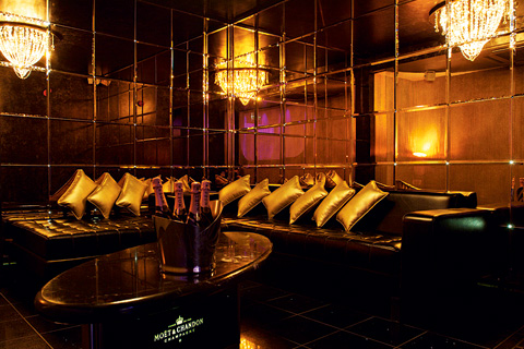 De spegelbeklädda väggarna ryktas ge sken av solbränna för att få gästerna att känna att de är på plats i Miami. Låt förfesten börja i den förbeställda limousinen med varsin divatini i handen. Väl framme rekommenderar vi sashimin som du bör förtära liggandes på en day bed. Champagneloungen i guld kan bokas för sällskap om femton gäster. Väl inne i vip-rummet serveras du Moët av en värdinna i gyllene cocktailklänning. Till minne av kvällen i denna lounge mottar du ett personligt halssmycke försett med ditt namn.
