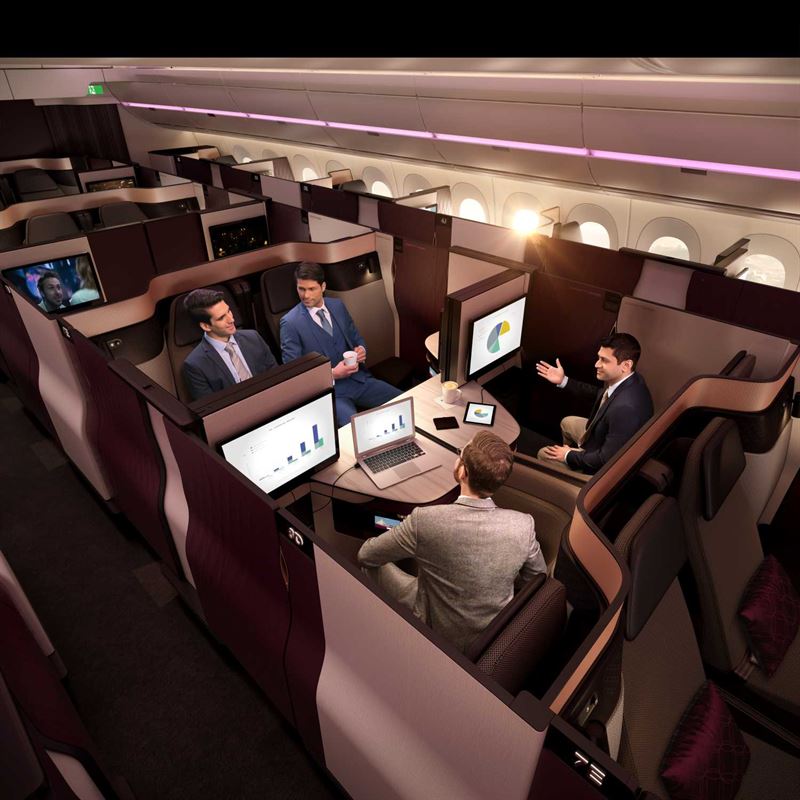 Borttagbara paneler gör att passagerare i angränsade platser kan skapa sitt eget privata rum. De justerbara panelerna och rörliga TV-skärmarna vid de fyra mittensätena gör det möjligt för kollegor, vänner och familjer som reser tillsammans att förvandla sitt utrymme till en privat svit, så att de kan arbeta, äta och umgås tillsammans.