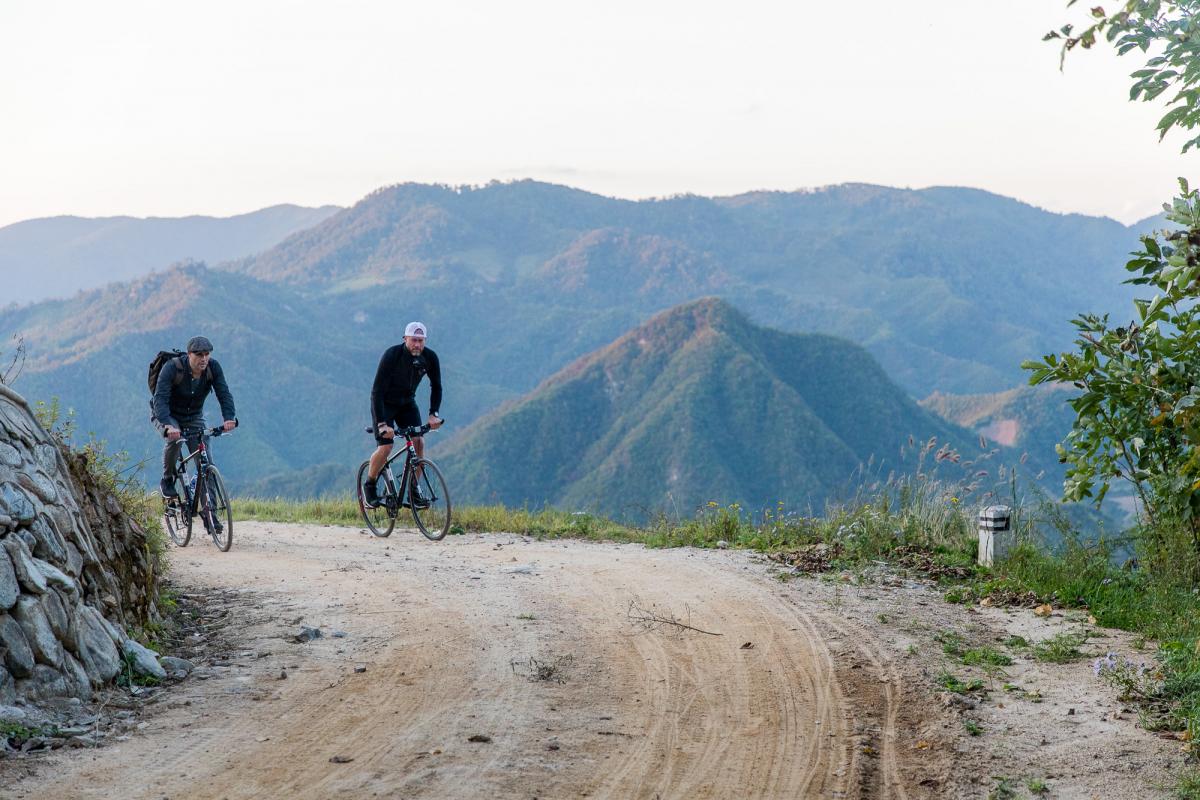 Vi prickar in ett högtryck i slutet av september och dagarna är ljumma. Vi cyklar mest i shorts och tunna tröjor. Vägarna kantas av rosenskära i rosa, vitt och purpur. Det är en blomma som hör till den koreanska faunan men som har planterats för hand längs vägarna. Varför? Våra guider stirrar på oss som om vi vore galna.