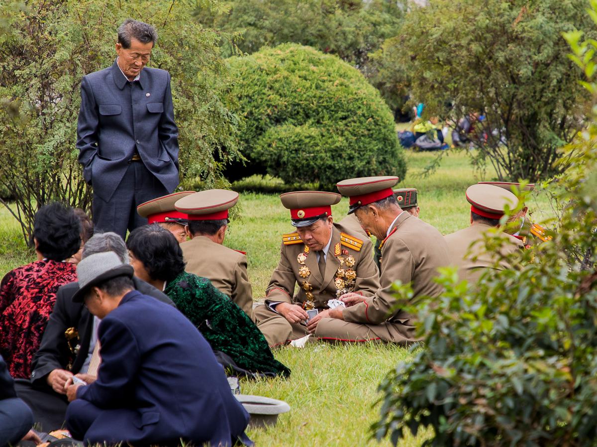 När vi cyklar genom Pyongyang får vi samma trevliga mottagande. Jag får filma utan restriktioner. Våra guider är uppsluppna och tillmötesgående. Vi trampar förbi nöjesparker och barn som åker inlines. I Moranbongparken i Pyongyang blir vi uppbjudna att dansa med lokala helgfirare. Det är picknickkorgar på gräset, ponnyridning och brudpar. Krigsveteraner med för stora kostymer och kilovis med tapperhetsmedaljer. Ungar som springer runt och slåss med pinnar, dansar och skrattar. Och musik överallt.