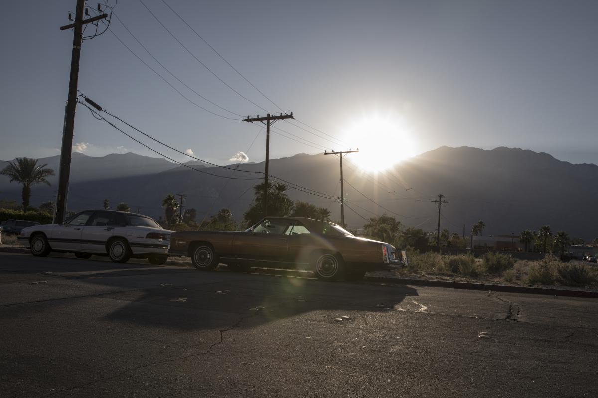 Vi åker nedför en av Palm Springs breda boulevarder, den svarta hyrbilen spinner som en katt. Solen står högt på himlen. Höga palmer sveper förbi och till vänster om oss, ovan den låga bebyggelsen reser sig de lätt disblekta bergen som ständigt ramar in staden på ett karakteristiskt sätt.