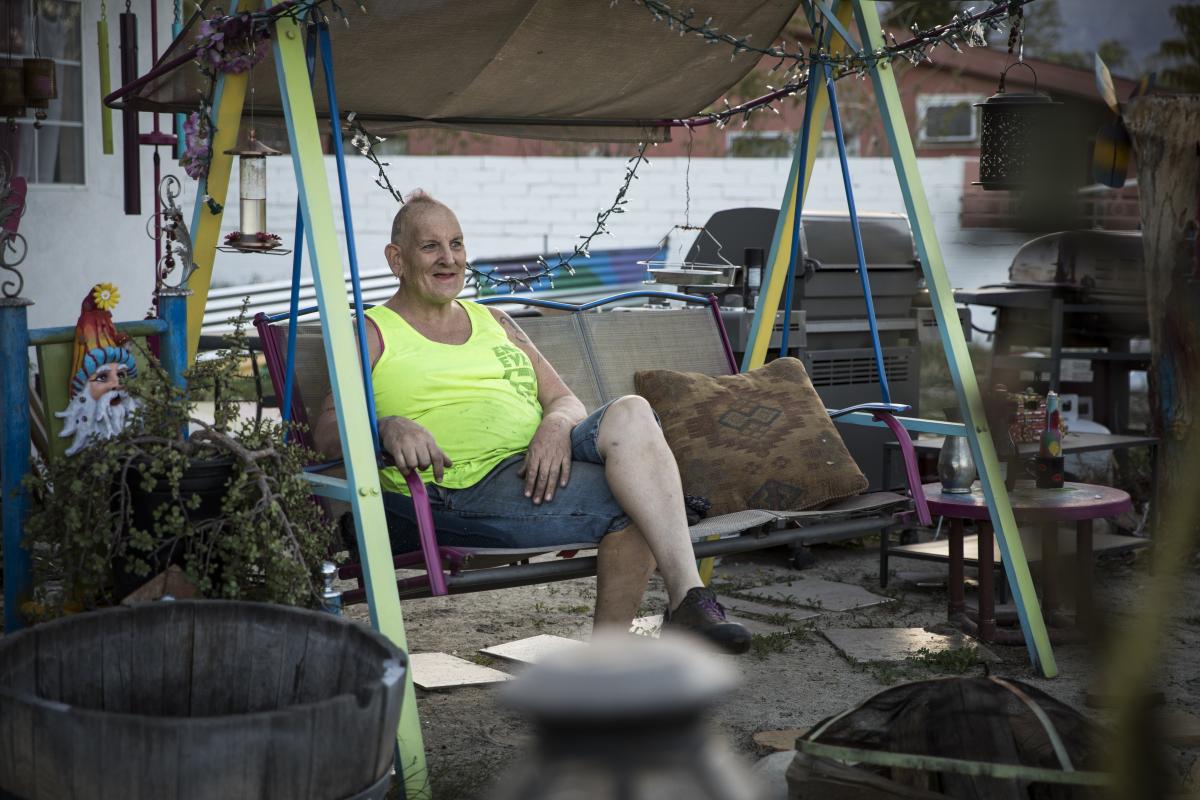 När vi dagen efter strax innan skymning kör runt på Palm Springs palmkantade boulevarder i jakt på eftermiddagsljus stannar vi intill en gammal fin sportbil, en Studebaker Avanti. Bilen designades 1963 i Palm Springs av den kända industridesignern Raymond Loewy, mannen bakom den ikoniska Coca-Cola-flaskan och Lucky Strike-cigarettpaketen. Medan fotografen plåtar plåt fångar en färgkaskad till trädgård mitt intresse en bit bort och jag traskar dit. Där, bakom ett vitt staket på en gård full av bråte, prylar och konstverk, står en lång person iklädd ett neongrönt linne, med kraftiga armar, rosa hår och tatueringar av godis på den renrakade sidan av sitt huvud. Det är Candy, hen håller på att skruva fast en barbiedocka på en fläktliknande mojäng som ska sättas upp i trädgården för att snurra i vinden. Vi börjar prata.