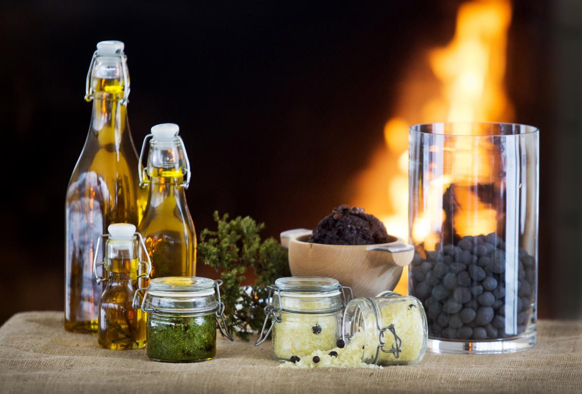 När man gör entre på Aurora Spa så går man på natursten med rinnande vatten och det känns som att vandra i en fjällbäck med porlande kallt vatten. Efter introduktionen till ”Aurora Spas stävanritual” som bygger på samiska läketraditioner får jag sänka ner mina kalla fötter i ett varmt fotbad med enbärssalt och citron och så låter jag fotsulorna masseras av små pelletskulor. Behandlingsritualen utför man på sig själv och i sin egen takt. Produkterna tillverkas på plats i Auroras Spa och innehåller naturliga råvaror från trakten och är fria från konserveringsmedel. Att massera in ansiktet med en kaffeskrupp känns lite udda men det doftar gott, desto härligare känns det att smörja in hela kroppen med en lenande kroppsolja gjord på rybs och doftsatt med tallarom.