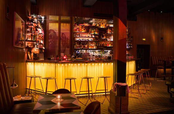 Läcker marockansk bar med focus på cool popkonst från 70-talet på väggarna och chic designinredning.