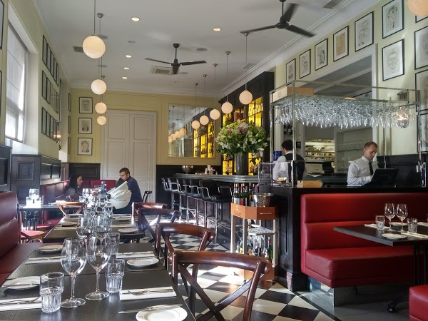 Fine dining. Brasserie med en bar i zink och karikatyrer av sina stamgäster på väggarna. Moderna europeiska rätter utförs med omsorg och passion. Köttet kommer från deras egen slaktare, med ett urval av kött från Polen, Irland och Australien.