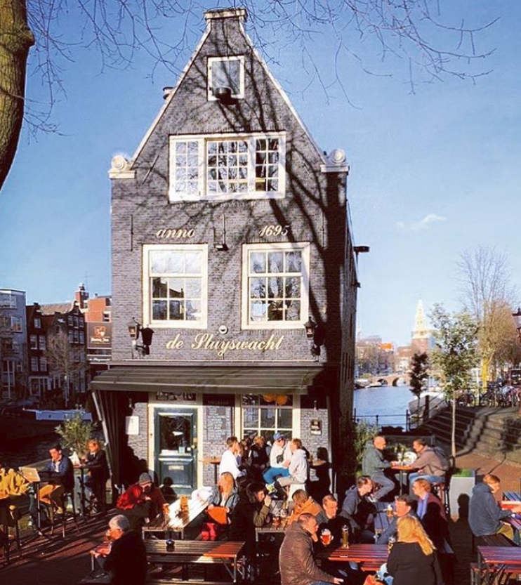 Ett charmigt kafé som huserar i en historisk byggnad som daterar tillbaka till 1695. Sluyswacht betyder låsvakt och i huset bodde den person som ansvarade för att kontrollera kanalens vattennivåer med hjälp av ett lås. Detta användes också för att förhindra fienders fartyg från att ta sig in i staden. Byggnaden har stått sig i över 300 år och fungerat som ett kafé/en bar i över 20 år. Sluyswacht har renoverats under åren men man har ändå lyckats bevara det i sitt ursprungliga skick varje gång. Hit kommer du inte direkt för den innovativa menyn – beställ en kaffe eller öl och sitt på terrassen och blicka ut över kanalerna.