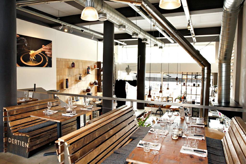 Pepijn Schmeink och kompani bjuder på en liten, men naggade god meny. En ekologisk sådan som består av en kött-, en fisk- och en vegetarisk rätt och som varieras efter säsong. Ät och trivs i industrichic miljö och passa för guds skull på att be om hjälp med att hitta rätt dryck till rätt mat. Dertien har en sommelier på plats för att bistå dig med just den saken.