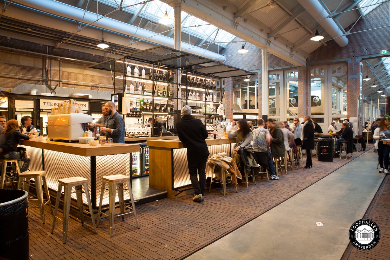Hallarna öppnade 2014 och är i dag en populär matmarknad och mötesplats med gott från hela världen. Njut av ostron i Gin & Tonic-baren eller provsmaka filmregissören Francis Ford Coppolas viner i baren intill. Hallarna bjuder på typisk food truck-mat som pulled pork, ekologiska ostar, vietnamesiska vårrullar och den omskrivna burgaren Dutch Weedburger –en vegoburgare gjord av alger. Stämningen är avslappnad och glad på Hallarna. Undvik helgkvällar om du inte gillar trängsel.