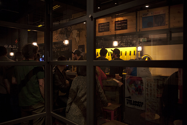 Garage Beer är en av de finaste ölbarer jag någonsin varit på. De gråmålade väggarna, retromöblerna och de obehandlade träytorna skapar en avslappnad men stilig miljö där de stora ståltankarna med hembryggd öl och de vackra ölkranarna står i fokus.