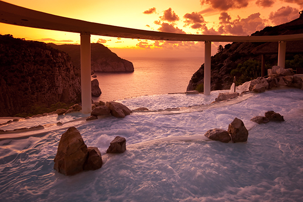 Det här hotellet tar det här med infinity pool till en helt ny nivå… Det kallas Las Cascadas Suspendidas och består av ett radband av thalassoterapi-pooler på terasser vid kanten av en 180 meter hög klippvägg ovanför en av norra Ibizas mest spektakulära havsvikar. Detta är också ett av öns äldsta och mest populära boutiquehotell som öppnade redan 1971. Grundarens son, Alvar Lipszyc, har under de senaste åren med varlig hand givit hotellet en välbehövlig ansiktslyftning och skapat en välbalanserad blandning av hippiechic, asiatisk asketism, traditionell Ibiza-arkitektur och glittriga stänk av glamour.