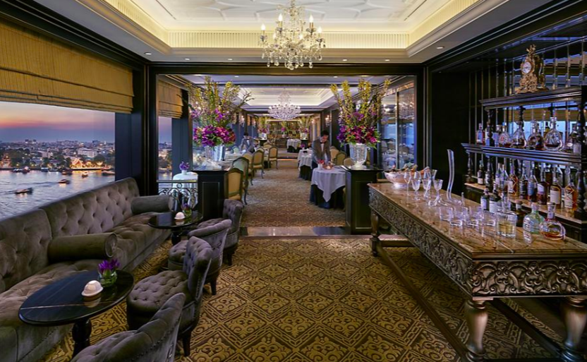Fransk fantasifull fine dining med fantastisk utsikt över Chao Phraya-floden. Vacker interiör med gamla kristallkronor och fantastiska blomsterarrangemang.