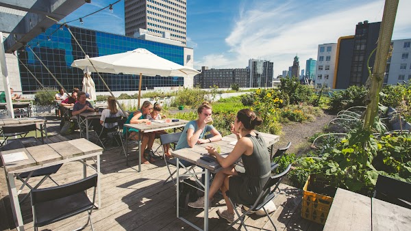 Op Het Dak betyder uppe på taket och det är precis där denna lunchrestaurang ligger. Bland höghusen vid centralstationen serveras vegetarisk mat där råvarorna hämtats från ställets egen ekologiska trädgård. Och ”op de grond”, nere på marken, hittar du stadens mest populära biergarten. Ett måste när solen är framme.