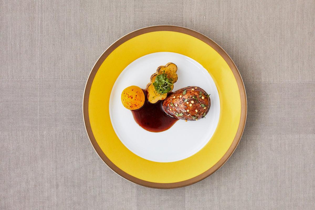 Huvudrätten ankbulle kompletterades med en vackert sansad potatis och en gulbeta som var svarvad på toppen. Den utvecklades till en mycket liten hög med spagetti som jag tyckte var lite svår att äta. Det känns alltid lite konstigt att “förstöra” vacker mat genom att äta den.
