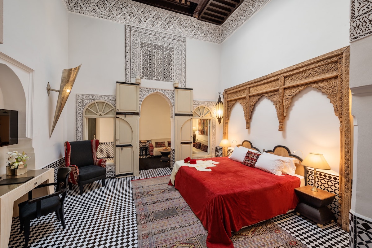 En av medinans vackraste riader. Bakom träporten döljer sig tio fantastiska sviter, ingen den andra lik. Vår favorit är Suite 1 som visserligen saknar utsikt, men är som en miniriad i sig.