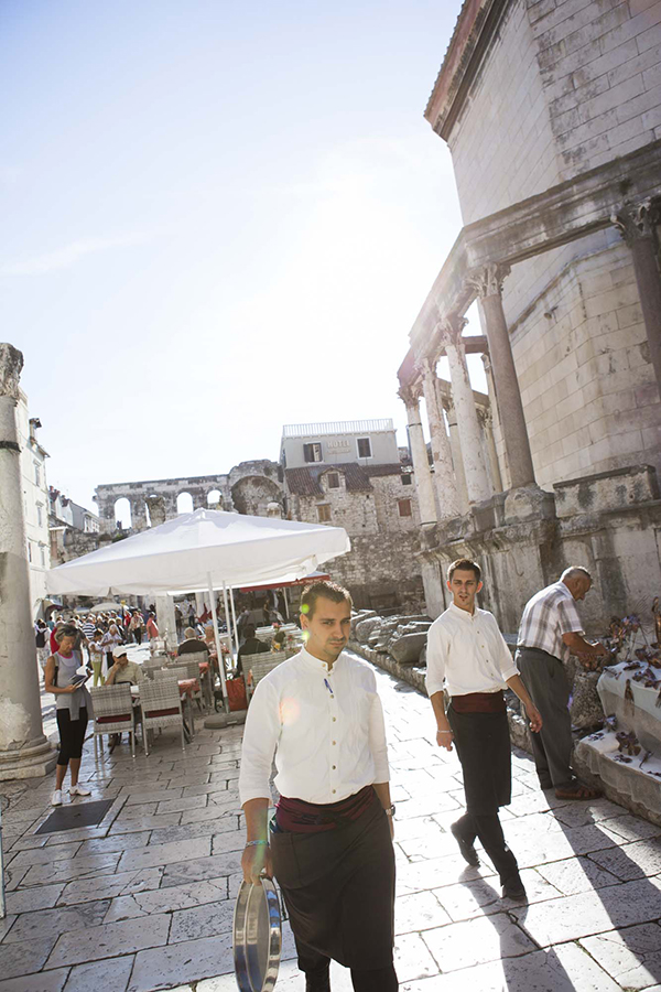 Utanför pågår stadslivet som vanligt. Tvätt hängs mellan de smala husgavlarna, katter lommar lojt runt och barnen leker tafatt mellan medeltida brunnar. Just arkitekturen är enastående, i Split kan den arkitekturintresserade på bara några minuter bocka av resliga renässansbyggnader och galanta, gotiska fasader tillsammans med uråldriga romerska mästerverk.