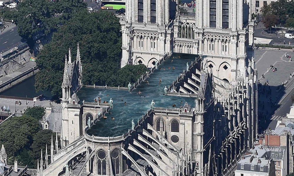 Drygt en vecka efter den stora branden som drabbade kyrkan i mitten av april föreslog en fransk firma att bygga ett jättelikt växthus på taket. Andra arkitektbyråer har föreslagit att ha en pyramidformad spira på taket eller en park. Det senaste förslaget som har väckt uppmärksamhet i världen är den svenska firmans förslag om en swimmingpool. Byrån har ritat upp en korsformad pool som täcker hela taket, omringad av statyerna av de tolv apostlarna som undkom branden eftersom de höll på att upprustas.