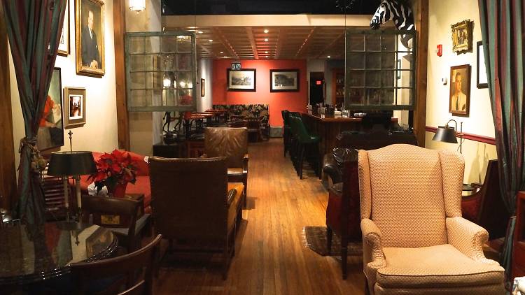 Vintagemöbler och ett mischmasch av olika tavlor skapar mysig vardagsrumskänsla på den här baren som är specialiserad på klassiska drinkar och whisky.