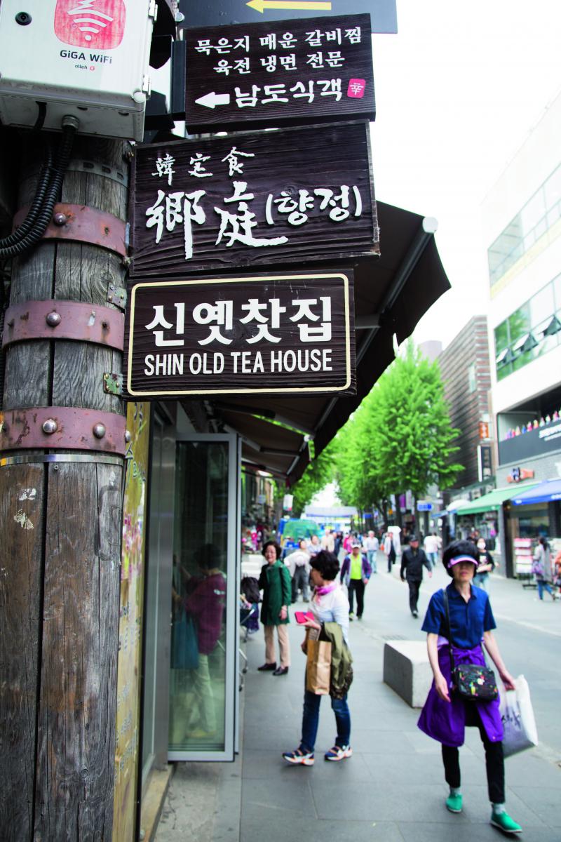 Väster om det vidsträckta Gwanghwamuntorget ligger Insa-dong, mest känt för sina många butiker och restauranger. Över gatan svävar förföriska dofter från olika stånd. Här utbjuds keramik, bakverk, te, smycken och traditionellt koreanskt hantverk, en perfekt plats för presentletaren. På inomhusmarknaden Ssamziegil huserar även några spådamer för den som vill informera sig om vad framtiden bär i sitt sköte. Vi vet redan att den för vår del innehåller en rejäl lunch, och styr våra steg mot tempelmatsrestaurangen Sanchon.