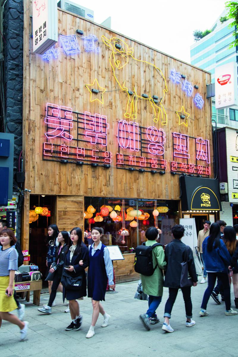 Dagens Seoul är en ung stad, och en stad för unga. Runt universitetsområdet Hongdae, den stadsdel som oftast utpekas som Gangnams efterträdare som partykvarter, ligger hundratals kaféer och barer. Hongdae är ett överraskande, energiskt och högljutt område som får mig högre i varv än ett sexpack red bull. Till vardags är gatorna fyllda av kläd- och prylförsäljare, på lördagar blir de istället en konst- och hantverksmarknad. Designhuset Sangsang Madang med sin vackra fasad i form av en fjäril i flykt är fyllt av unga konstnärer och kreatörer som här får möjlighet att pröva sina vingar, inklusive liveuppträdanden och gallerier. Temakaféer är populära, vi pustar ut från hetsen på ett fårkafé och fikar tillsammans med lammen Ana och Sam.