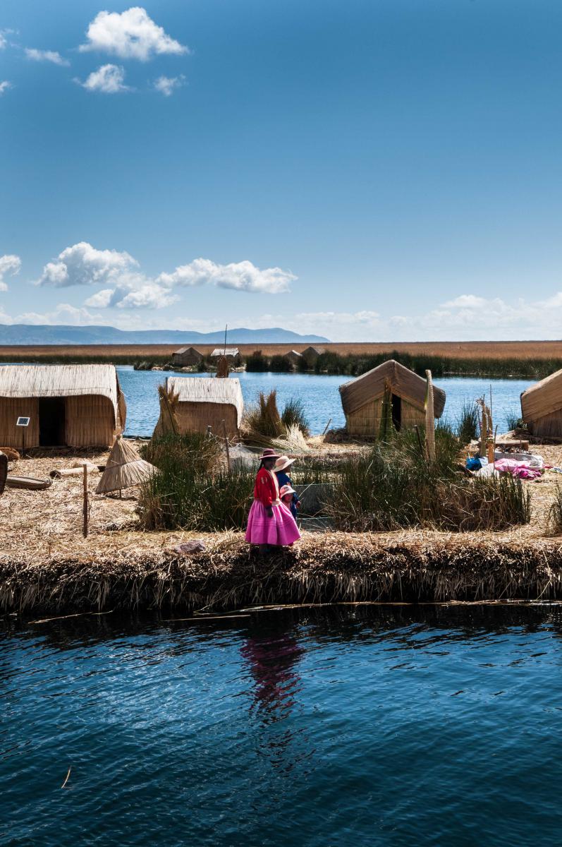 För mig är Titicacasjön Andernas navel och centrum. Sjön är en oas mitt bland de omgivande öknarna och ett himmelrike för en mängd olika arter av sjöfåglar, exempelvis titicacadoppingen som bara finns här. På den nordvästra sidan av sjön ligger staden Puno. Här hyr vi en motorbåt som tar oss ut till några avlägsna öar. I den tidiga, kyliga och klara morgontimmen möter vi på väg ut den ena vassbåten efter den andra fullastade med varor som ska säljas på marknaden i Puno. Efter ett par timmar stiger vi i land på den flytande ön Taquile, stor som en tennisplan. Det gungar betänkligt under mina fötter när jag går i land, men det är ändå stadigare än vad jag trott. Allt är nämligen byggt av totoravass. Hus, båtar ja till och med sängar i de små hyddorna. På ön bor tre familjer som livnär sig på fiske och hantverk och där emellan något turistbesök.