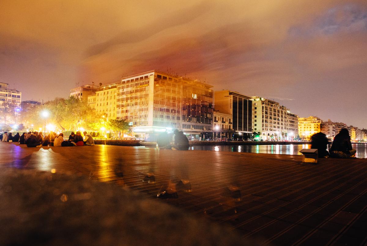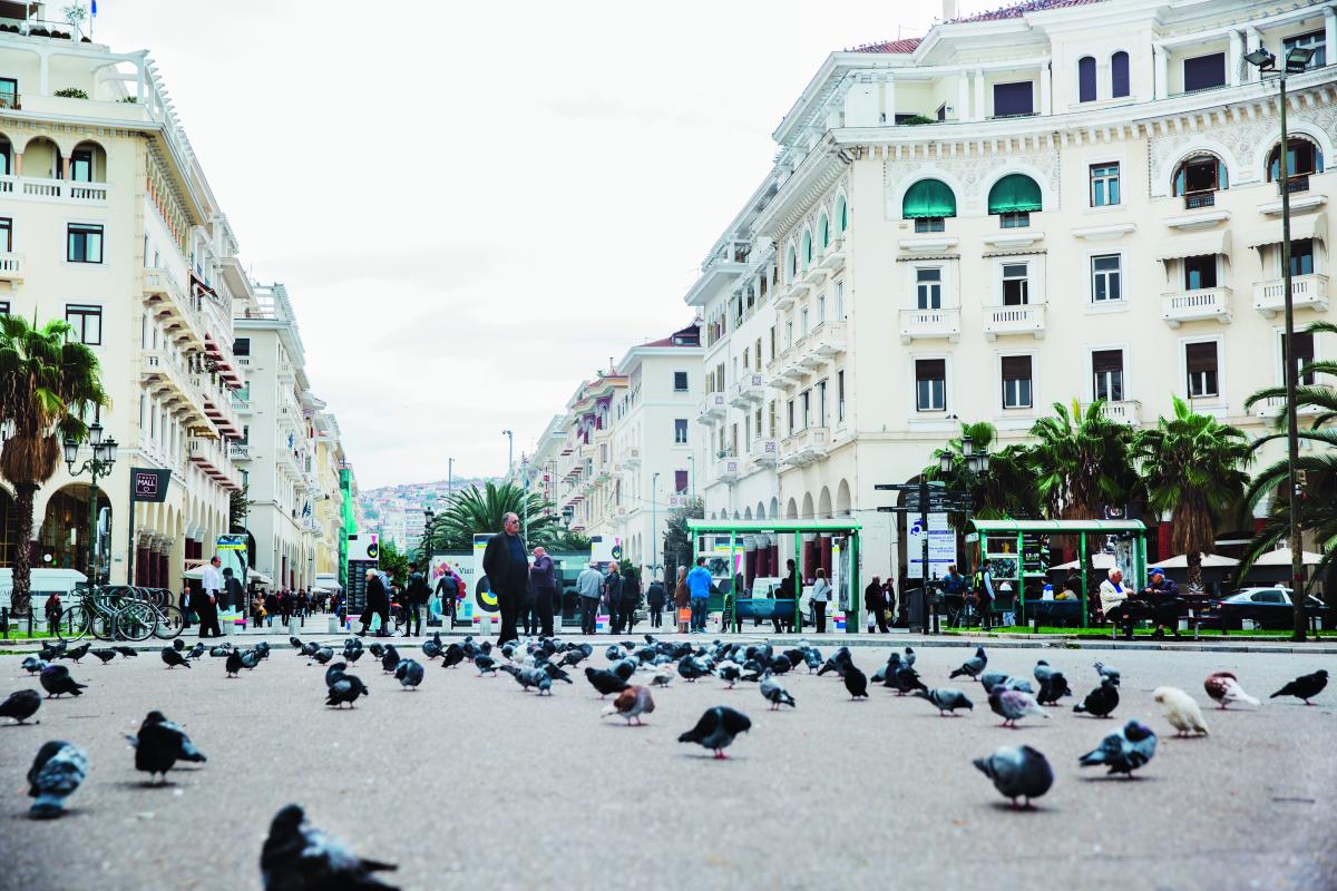 Om man promenerar från stranden vid Medelhavets kant reser sig staden uppåt, uppåt, uppåt. Jag och min fotografkollega irrar runt på smala vägar och i kringelkrokiga gränder. Utgrävningar på ena sidan, breda shoppinggator på andra, ett judiskt hamam i blickfånget som sedan byts ut mot en designbutik. Högst upp tronar stadsmuren och de turkiska kvarteren. Längst ned ståtar Aristotelestorget där kaféerna och barerna trängs med varandra, där gatulivet är brusigt och med utsikt mot såväl hav som upp mot de övre delarna av staden. Vi upptäcker snabbt att kaffet blir billigare ju högre upp man kommer. Thessaloniki grundades först på 300-talet f.Kr, som en del av kungariket Makedonien. Romarna följde på kungarikets fall och på 1400-talet tog det Ottomanska riket över. Grekisk blev staden 1912 men efter en brand 1917 förstördes delar av den till oigenkännlighet. Endast den övre delen klarade sig intakt.