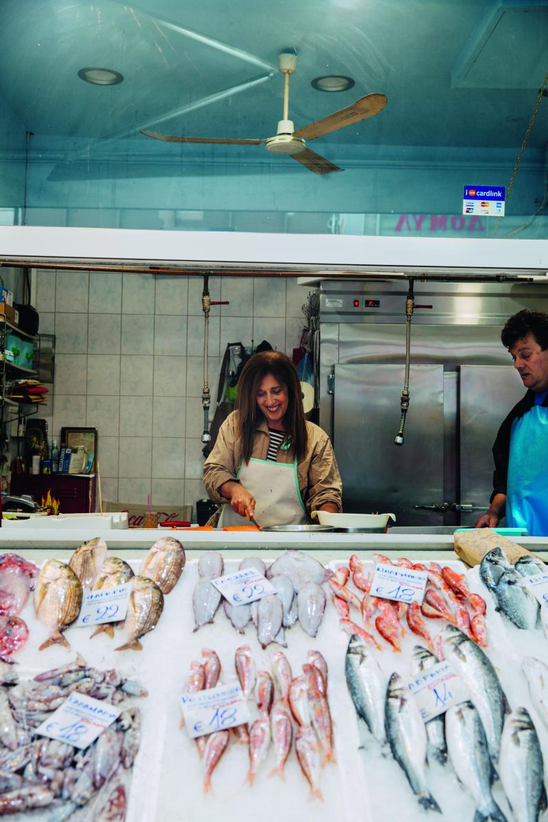 – Det mesta av det du ser här kommer från regionen. Köttet är från bondgårdarna i området, vindruvorna odlas två timmar bort, sardinerna och anjovisen är från havet utanför bukten, förklarar Georgios medan han stegar fram i labyrinten av ropande försäljare och överfulla bord.