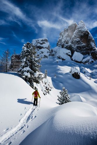 Barn som växer upp i snöiga delar av världen hoppas ofta på att en kraftig snöstorm ska ge dem en dag ledigt från skolan. I Cortina d’Ampezzo, som fick 20 meter snö förra vintern, stängde skolorna en hel vecka eftersom föräldrar oroade sig över att deras barn skulle krossas av de kompakta snömassorna från de glaciärliknande taken ovanför deras huvuden. Hela alpområdet drog igen fönsterluckorna under en hel säsong av megastormar som började strax innan jul och sträckte sig ända in i mars och dalens guider jobbade dubbelt med att skotta tak och att gräva fram bilar. Många säger att de inte har sett så mycket snö på 50 år. Eftersom ingen för officiell statistik för sådant i Italien får vi nöja oss med att säga att det var ett bra tag sedan människorna i Cortina såg något liknande. Men ovädret har gett skidåkare en fantastisk present i ett område som vanligtvis förknippas med soliga, öppna landskap där man stillsamt glider fram. Även om förra året var långt ifrån normalt i Cortina – mitt i Dolomiti Superski, världens största skidregion med 12 skidområden, 450 liftar och 1 200 km pister som binds ihop av en enda biljett – var snöfallet definitivt inte en besvikelse.
