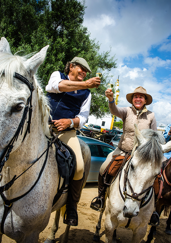 Medan vi fortfarande sitter till häst kommer kyparen ut med sherryglasen balanserande på en bricka för en välkomstskål. Det blir en perfekt avslutning på en lång dags ritt mot natt. Hästsällskapet är dock inga snabbskjutande västernhjältar utan tio hängivna ryttare från Sverige, Frankrike, Österrike och England. De har alla sökt sig hit för att möta våren i de vackra omgivningarna runt nationalparken Doñanas i Costa de la Luz vid floden Guadalquivirs deltalandskap. När vi anländer till Rocío har vi nått halvvägs på vår veckolånga ridtur ledd av María Elena Dendaluce och Alfonso Gonzalo de Bustos. Ridturen startade för några dagar sedan från La Corbera i Utrera Sevilla, där vi bodde de två första nätterna, samt ytterligare en natt på Ardea Purpurea vid Villamanrique de la Condesa.