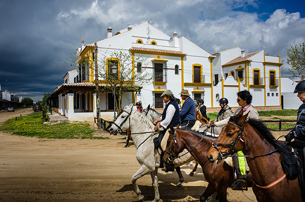 Scenen skulle kunna vara hämtad från en inspelning av en spansk vildavästernfilm, som under 1960-talet gick under smeknamnet ”spagettivästern”. I samlad galopp rider vi in på Rocíos sandiga huvudgata och svänger upp mot restaurang El Toruño i slutet av vägen. Här skulle Charles Bronson eller Clintan när som helst ha kunnat dyka upp i något av gathörnen tänker jag när vi i ett moln av damm bromsar upp framför träräcket med skylten ”Endast för hästar”. Regissören Leones vackra bildspråk från filmen För en handfull dollar, som spelades in här i södra Spanien, har vissa likheter med vår ankomst till denna vackra, men samtidigt lite overkliga stad i hjärtat av Andalusien, tio mil sydväst om Sevilla.