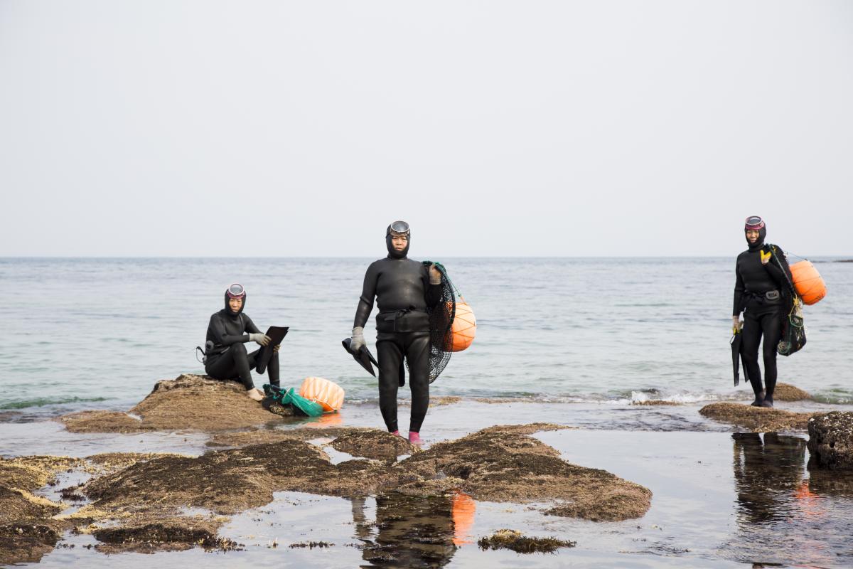 När vi kör längs Jejus kust ser vi dem överallt. I havet vid lysande orangea flytbojar mellan dyken, på stranden i svarta torrdräkter eller på fyrhjulingar och lastbilsflak på väg hem med sin fångst. De kallas Haenyeos, havskvinnor. Dessa Jejus dykande farmödrar lever på det havet ger och ses i dag som något av en nationalskatt, en av få.